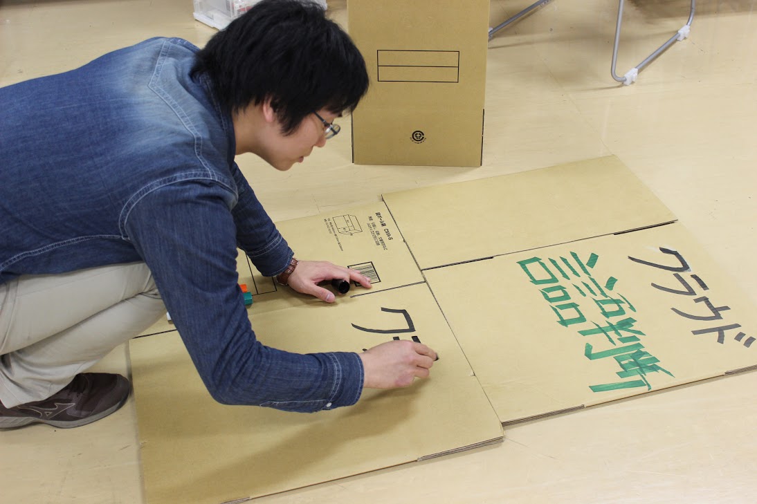 経由が想定されるクラウドサーバをダンボールで作り、演劇要素を混ぜたプレゼンでした。